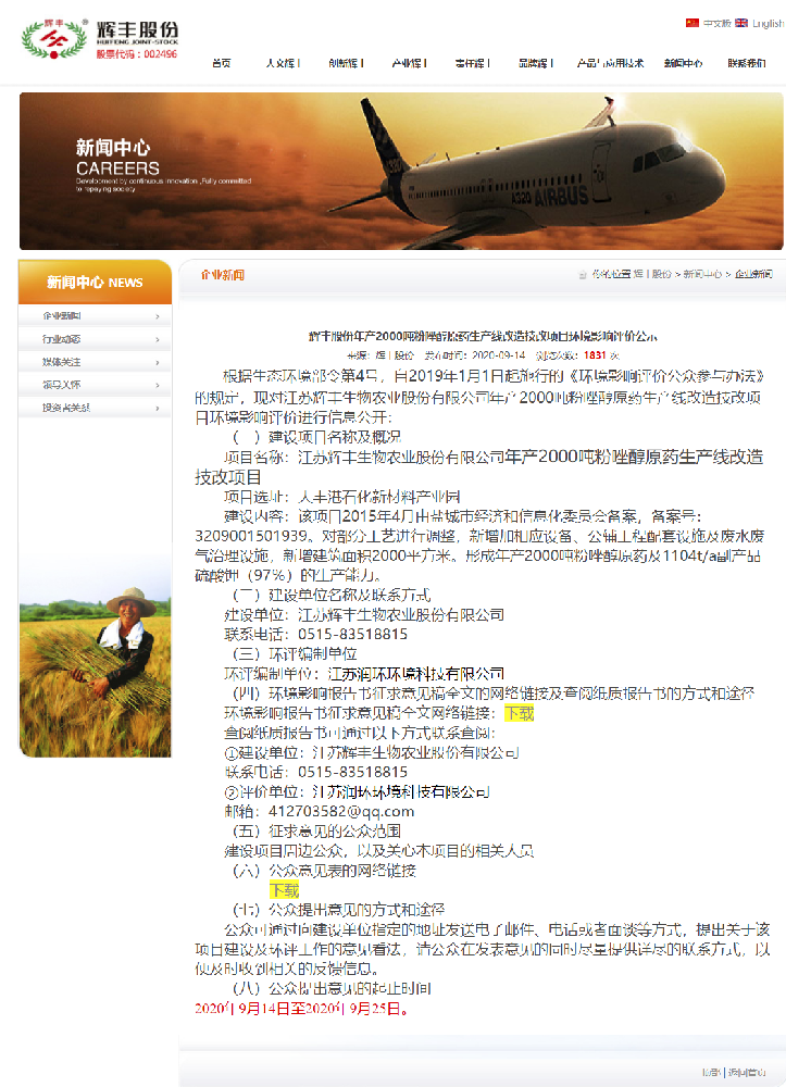 江蘇輝豐生物農(nóng)業(yè)股份有限公司年產(chǎn)2000噸粉唑醇原藥生產(chǎn)線改造技改項(xiàng)目環(huán)境影響報(bào)告書按照《環(huán)境影響評(píng)價(jià)公眾參與辦法》(生態(tài)環(huán)境部部令 第4號(hào))要求進(jìn)行公眾參與,具體為;2020年9月14日~2020年9月25日在輝豐公司網(wǎng)站上向相關(guān)公眾對(duì)項(xiàng)目情況、環(huán)評(píng)情況進(jìn)行了征求意見稿公示。網(wǎng)站鏈接地址為:http://m.centregarden.com.cn/index.php?a=article&aid=1112,公示期10個(gè)工作日。