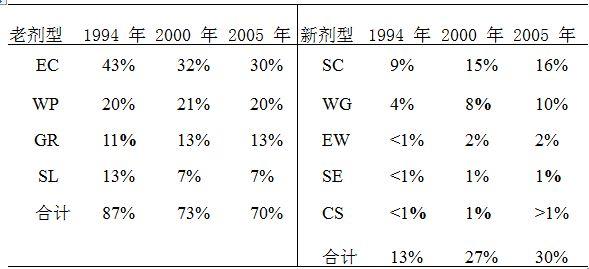 表3: 1994-2005年全球農(nóng)藥新老劑型占比統(tǒng)計