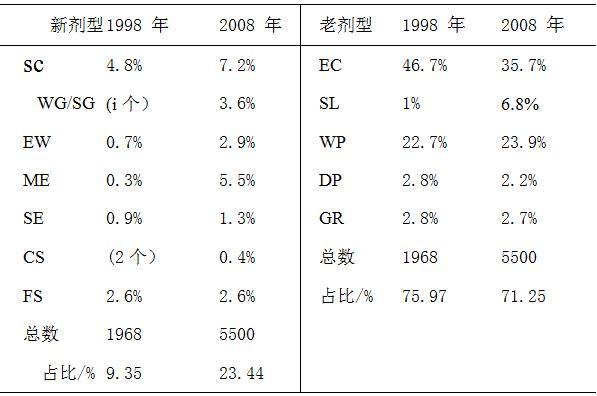 表1: 1998、2008年中國農(nóng)藥老、新劑型產(chǎn)品規(guī)格數(shù)占比(剔除相同產(chǎn)品后統(tǒng)計)